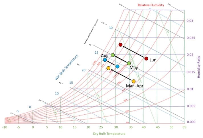 Outdoor thermal comfort is influenced by air temperature, humidity ratio, wind speed, and mean radiant temperature. Passive strategies such as shading, hot wind protection, sky cooling, and evapotranspiration were integrated along with mist cooling to enhance comfort levels.